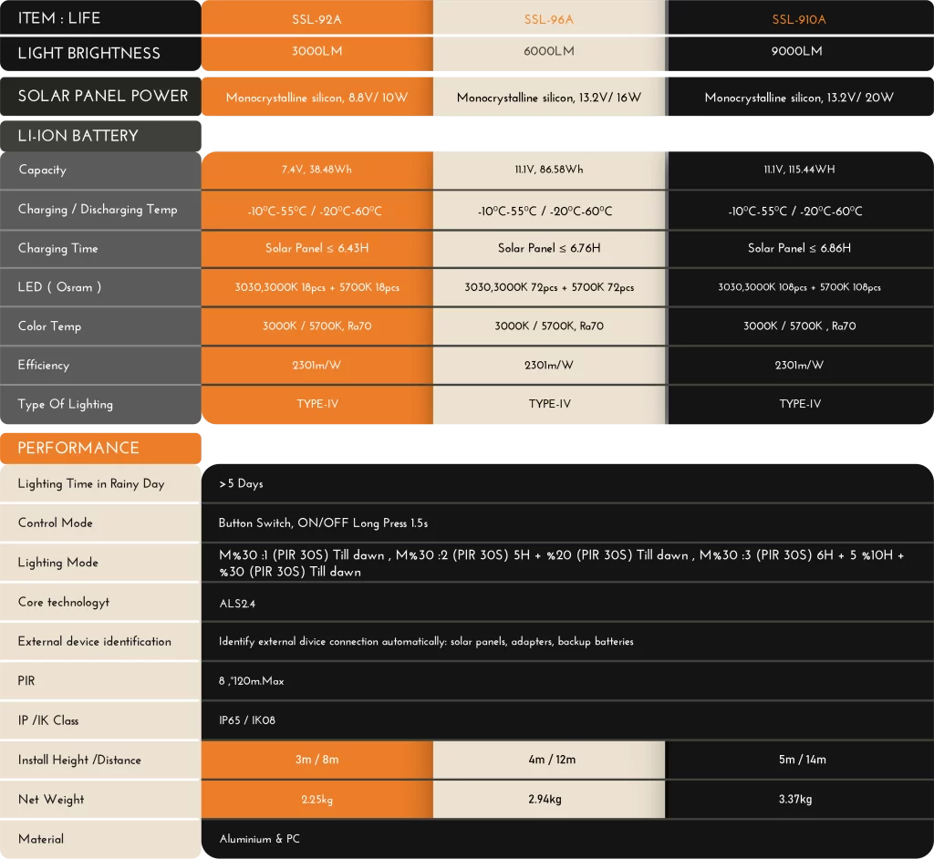 Compare three LIFE streetlight models 3000LM, 6000LM, and 9000LM featuring varied brightness, panel wattage, battery capacity, and smart control features. Tailored for every streetlight application from campuses to commercial zones.
