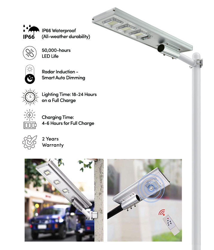 • Lighting Time: After charging, the solar street light can provide continuous lighting for a period of 18-24 hours. It can operate through an entire night, ensuring that your outdoors are bright.
